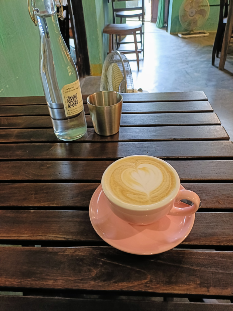 いい感じの店内です.ケーキも美味しそうでしたが,お昼にカオラウとコムガーを食べたのでカフェラテのみ頂きました.