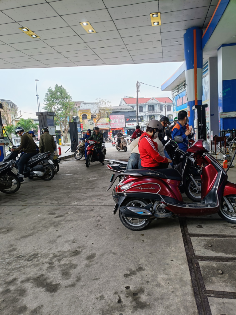 こちらはバイク用の給油スペース,自動車用とは別れています.皆さん,30,000 VNDなどと注文していますが,分からない私は”Full”と言ったら,給油してくれたおばちゃんが”Where from?”と聞いてきましたので,外国人観光客も多いのでしょう .おばちゃんは上手いこと満タン近くできりのよい70,000 VND分入れてくれました.