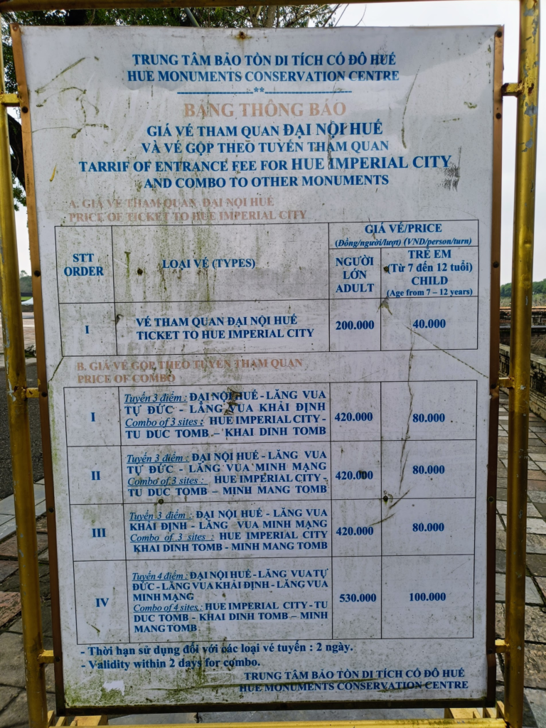 王宮入口手前にチケット売り場があります.宿で教えてもらったとおり,王宮を含む数カ所の帝陵を回るためのコンボチケットが販売されています.上から3つが合計3箇所,一番下が4箇所を見学できます.特別に計画のない私は,一番上の王宮とTU DUC TOMB, KHAI DINH TOMBのコンボチケットを購入.