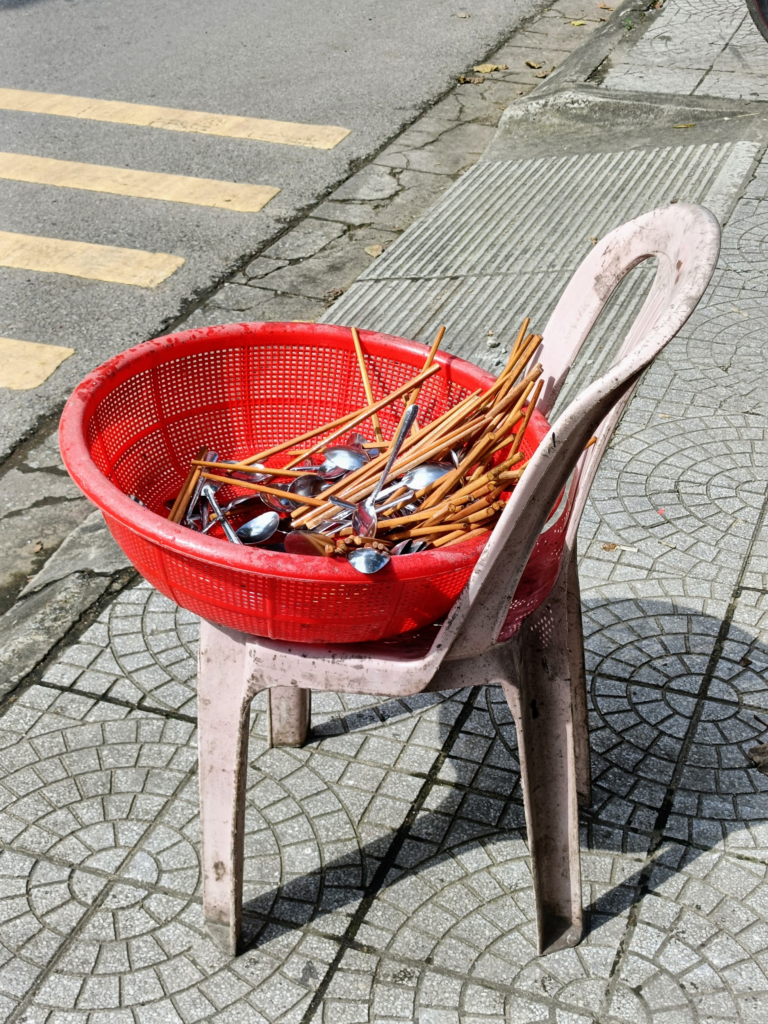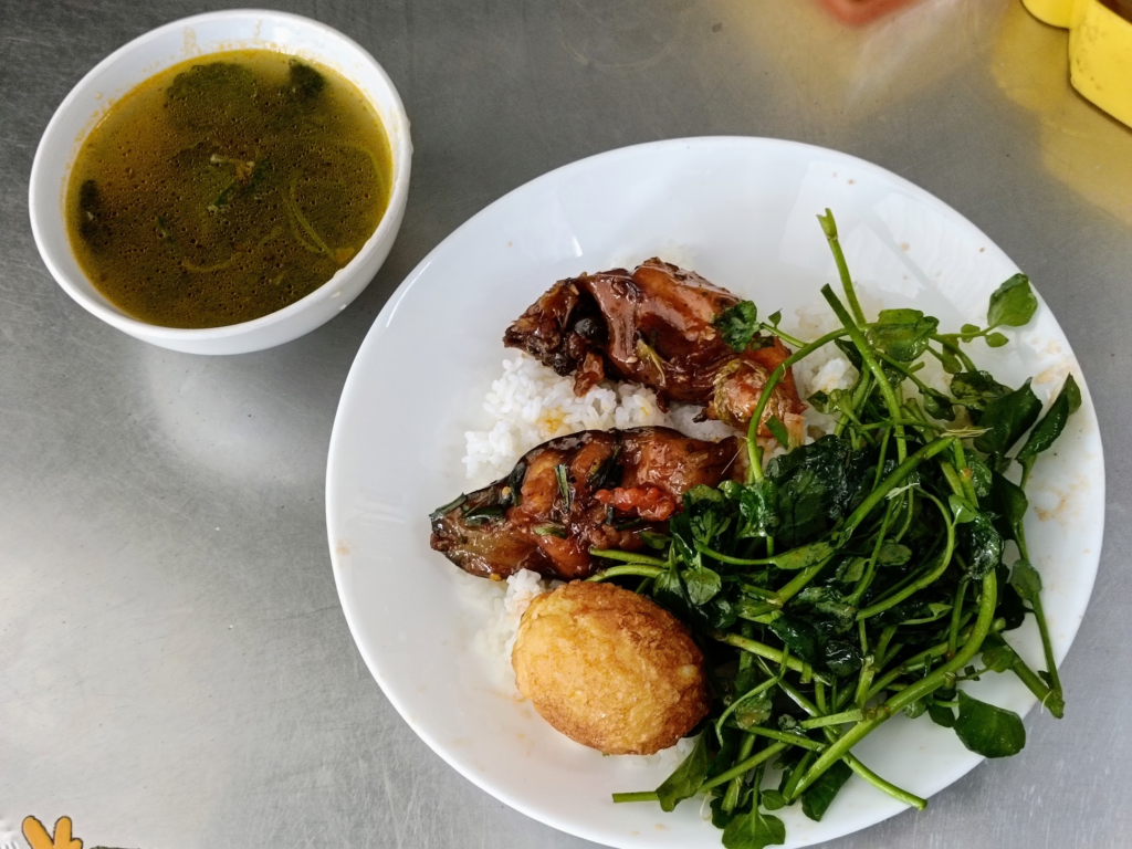 どうやって注文するのか分からないながらも何とかなりました.魚と鶏と卵と野菜載せご飯,500,000 VND.洗ったお箸は天日干し.