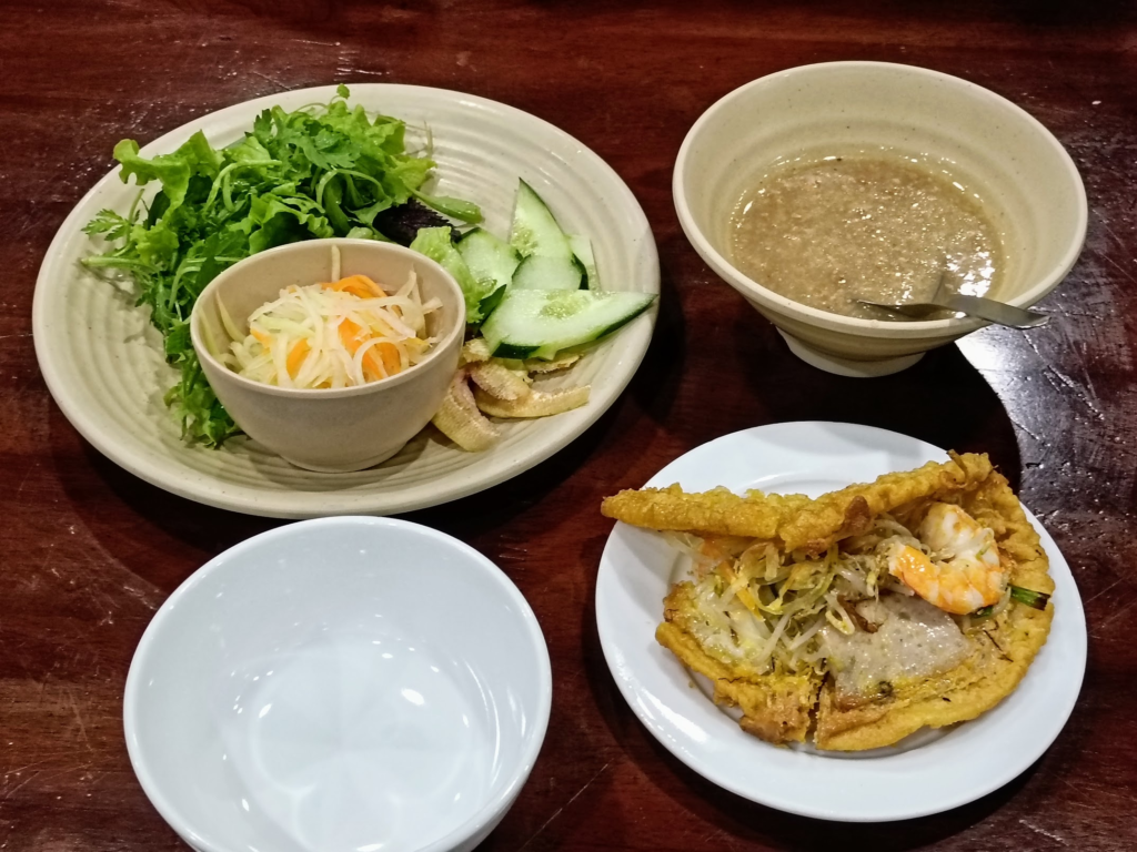 注文した1品目はフエ名物の1つであるBánh khoái Huế バインクアイ.フエスタイルのお好み焼きで,野菜と一緒に豚レバーとピーナッツのたれで頂きます.40,000 VND.