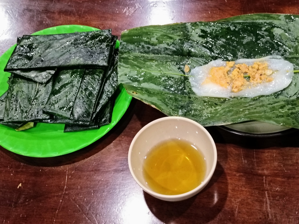 2品目はBánh nậm バインナム.こちらもフエ名物で,米粉などを刻んだエビや豚肉と共にバナナの葉っぱに包んで蒸したものです.60,000 VND.