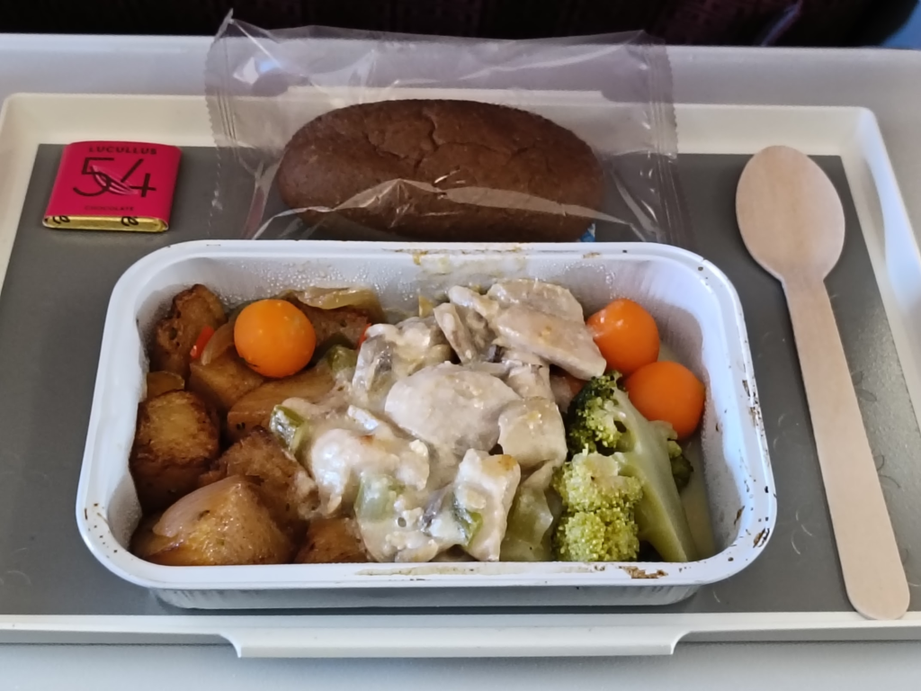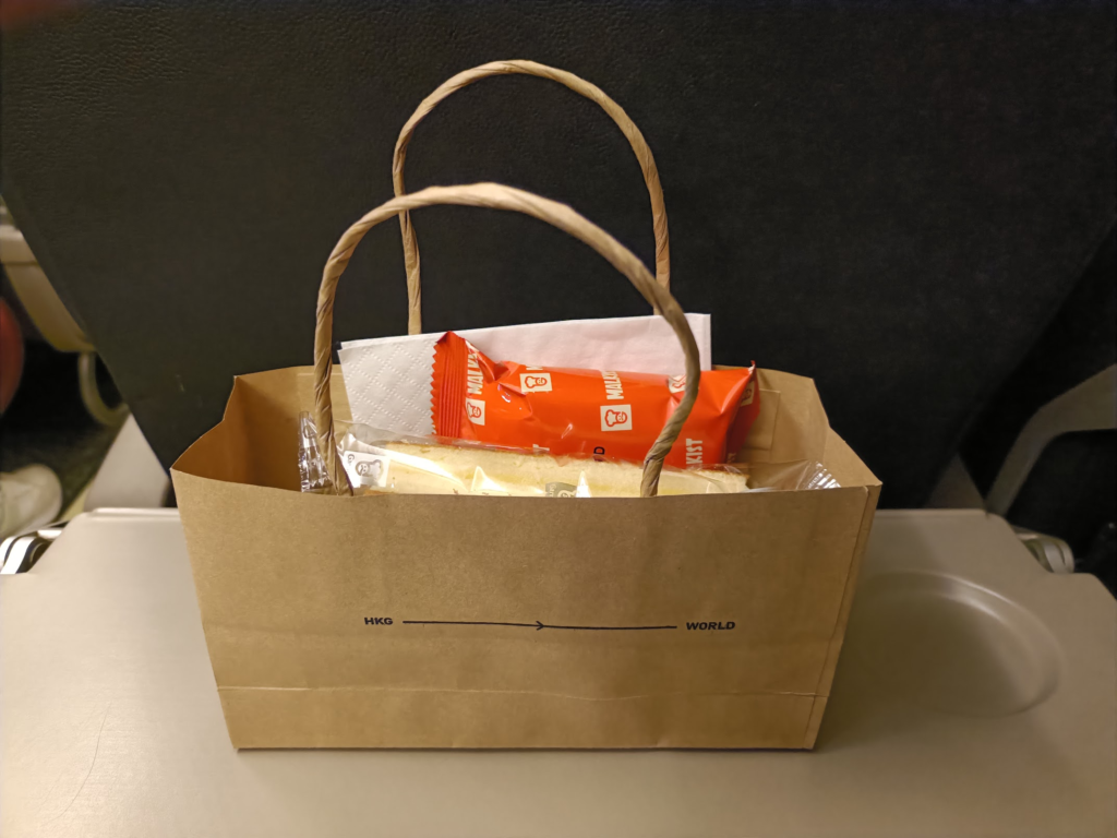 睡眠不足の体にカクテルとお粥が染み渡ります.定刻が近づいてきたので,シャトルに乗って搭乗ゲートへ.定刻に搭乗が始まった新年フライトも搭乗率は高めでした.この旅4回目の香港航空,最後にきちんとした食事が出てきました.終わり良ければ全て良し.